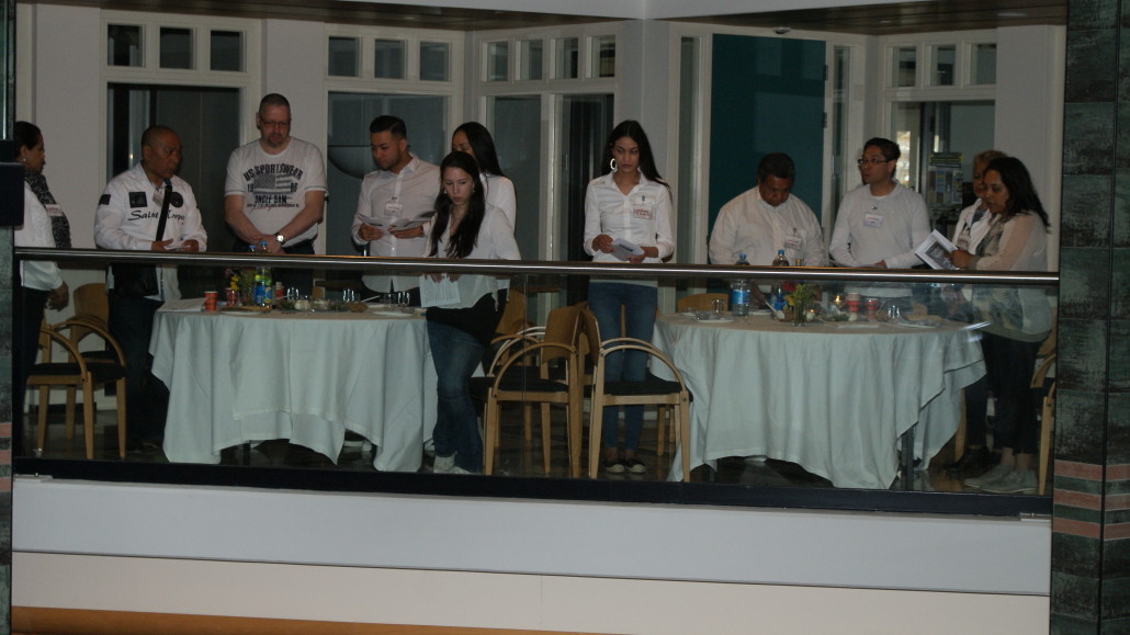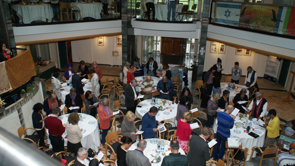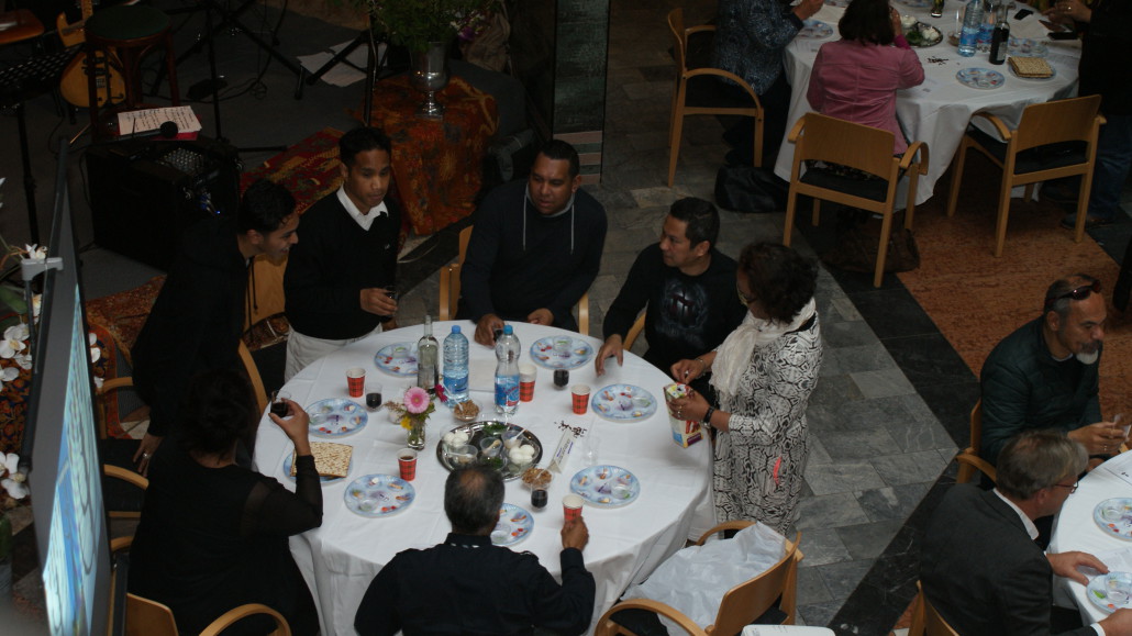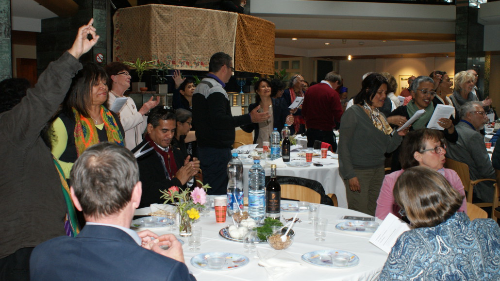 Er wordt wat afgesjouwd, gerechtjes voor de sedertafel klaar gemaakt enz. Tussentijds de nodige koffie en thee gedronken… De band zet zijn spullen klaar en doet een soundcheck, alle laatste zaken worden geregeld. De gasten komen nu geleidelijk binnen, sommigen zijn opgehouden door files, een ander komt niet omdat hij door de files veel te laat zou aankomen, jammer! Volgend jaar maar weer proberen, het zal zeker lukken, want het is een feest dat je mee moet maken. Een feest is het zeker geworden, maar ook met momenten van bezinning over wat er voor en tijdens de uittocht van het volk Israël uit Egypte gebeurde. De band o.l.v. Peter Lengams heeft ons geweldig begeleid bij de liederen en heeft ook zelf liederen ten gehore gebracht! We zijn door alle symbolen van de sederviering heen gegaan en hebben momenten genomen om tot ons door te laten dringen wat er met het volk van God is gebeurd en wat een geweldige bevrijding Hij heeft bewerkt voor Zijn volk in de eerste plaats. Daarnaast hebben we gekeken wat het voor ons betekent die in Yeshua/Jezus geloven. Er zijn zoveel symbolen die naar Hem verwijzen: het Lam dat geslacht is, de matzes, de afikoman, de wijn, de afgoden die door God werden ten toon gesteld… Het was niet per toeval dat deze plagen werden uitgevoerd! Want God vernederde hiermee de afgoden van Egypte, die stuk voor stuk in ‘hun specialisme’ te kijk werden gezet. Het geeft zo’n verdieping in je geloofsleven om te zien hoe gedetailleerd alles door God gepland is! Geweldig, we dienen een levende God, Hij is de Grote Overwinnaar! Het is Zijn feest en wij mochten Zijn gasten zijn, alle dank en lof aan Hem.